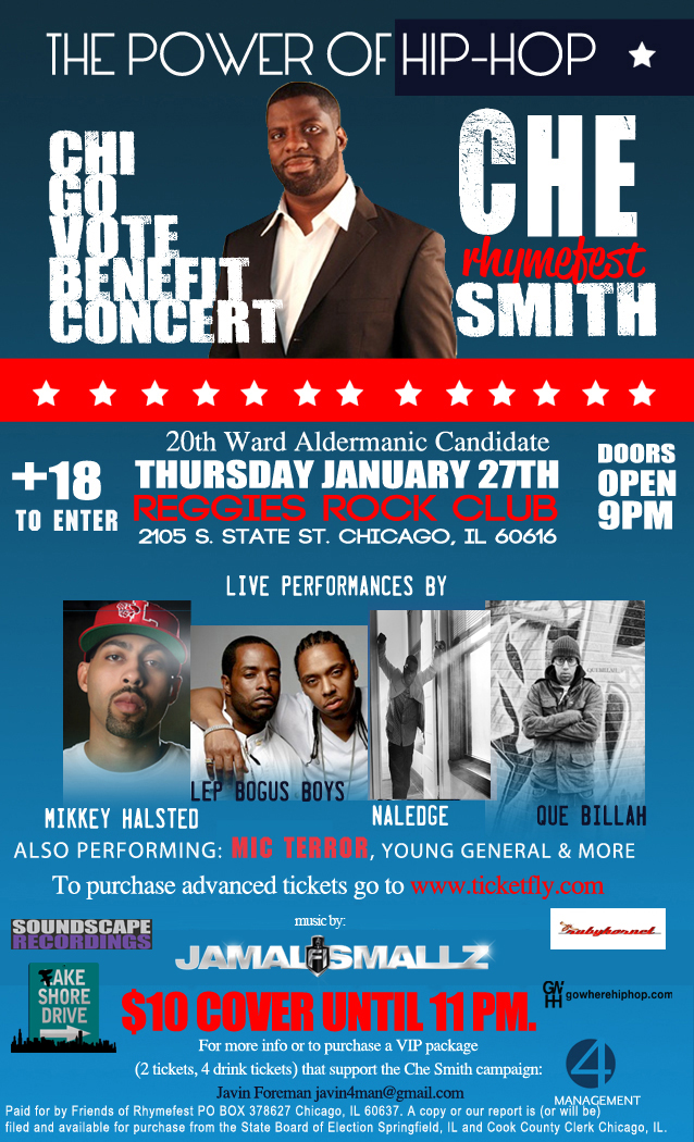 Join Che “Rhymefest” Smith on Thursday January 27th for the Chi Go Vote Benefit Concert. The show takes place at Reggie’s Rock Club and also features performances from Mikkey Halsted, GLC, Naledge, Que Billah, and LEP Bogus Boys. See the full flyer after the jump.